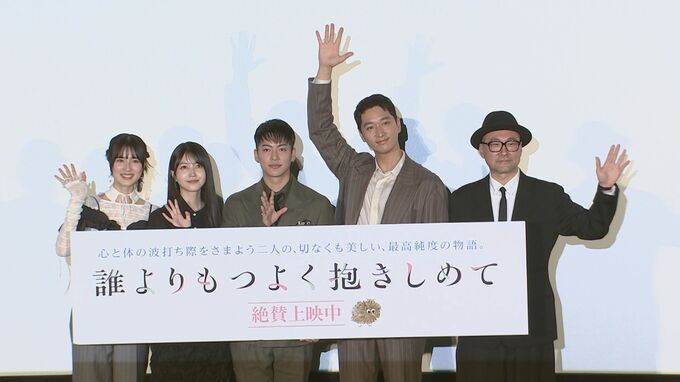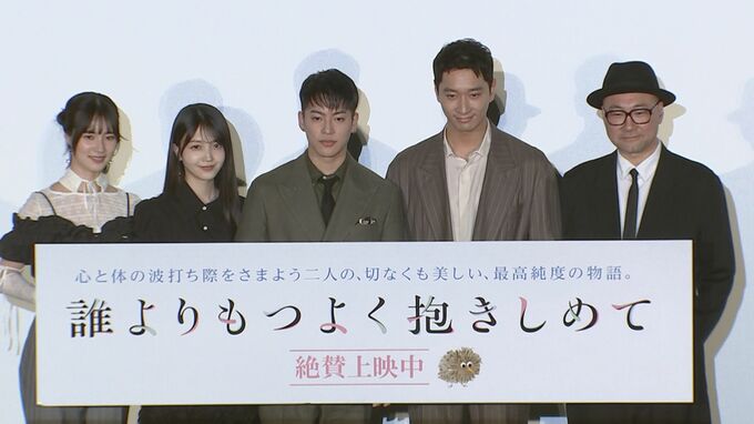 三山凌輝さん(BE:FIRST)、久保史緒里さん(乃木坂46)、ファン・チャンソンさん(2PM)、永田凜さん、内田英治監督が、映画「誰よりもつよく抱きしめて」公開記念舞台挨拶に登壇しました。