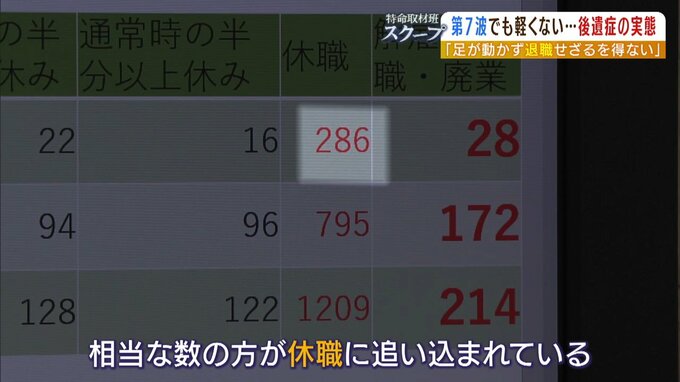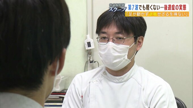 「高齢者にケガをさせるのが怖い」“足のしびれ”のコロナ後遺症で退職...オミクロンでも軽くない後遺症の実態「相当な数の方が休職に追い込まれている」 毎日放送 2022年10月6日(木) 14:43 国内 コロナ 後遺症対応のクリニック院長「休職になっている方が約500人中300人弱」 東京でコロナ後遺症の患者を診ている平畑院長によると、ここ半年で受診した後遺症患者は生活に大きな影響を受けている人が増えているという。 (ヒラハタクリニック 平畑光一院長) 「オミクロンに入ってから、労働者523人中、もう仕事を失っている方が28人いらっしゃる。休職になっている方が約500人中300人弱です。相当な数の方が休職に追い込まれている」