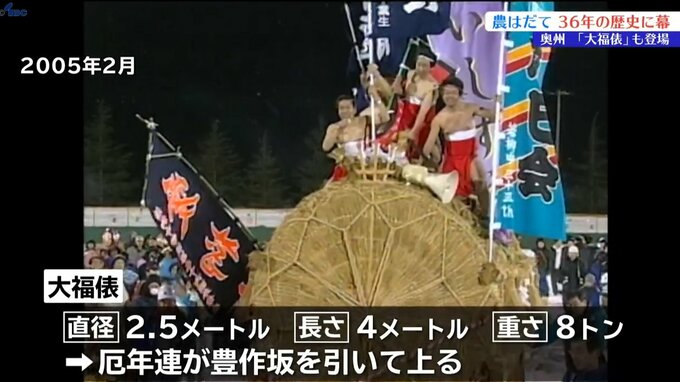 また、祭りでは直径2.5メートル、長さ4メートル、重さ8トンの「大福俵」を厄年連が引いて豊作坂を上るのが祭りのクライマックスになっていました。