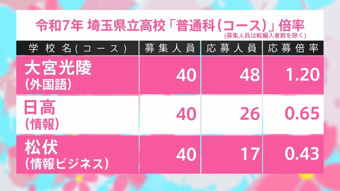 埼玉県立高校入試2025 全日制普通科 志願倍率は大宮1.64倍、浦和1.55倍、川越1.54倍に【令和7年度高校受験】 TBSテレビ 2025年2月10日(月) 17:00 国内 普通科(コース制)一覧 大宮光陵(外国語)1.20倍、日高(情報)0.65倍