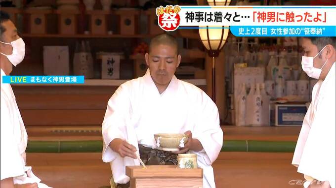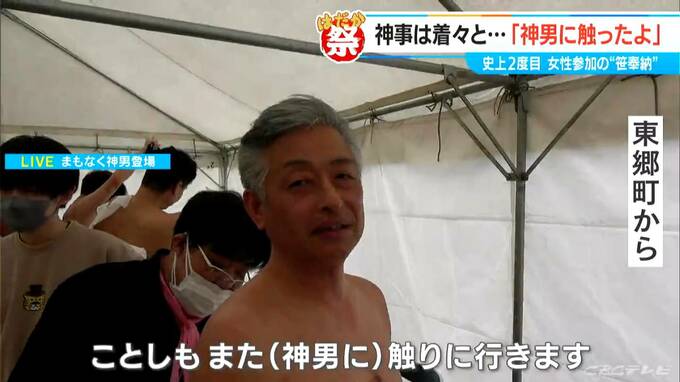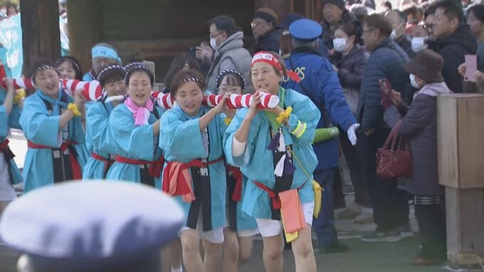 女性たちが担いでいるのは笹。「もみ合い」の前に行われた「なおい笹奉納」です。笹には、祭りに参加出来ない人などが“厄除けの願い”を書いた布が結びつけられています。