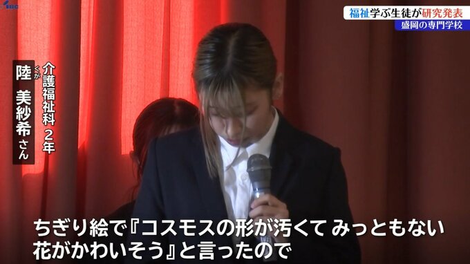 このうち陸美沙希さんは、実習先で認知症がある利用者と花のちぎり絵やぬり絵に取り組みました。