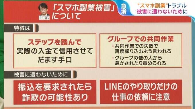 振り込みを要求されたら詐欺の可能性があり、またLINEのやり取りだけでの仕事の依頼には十分に注意してほしいということです。