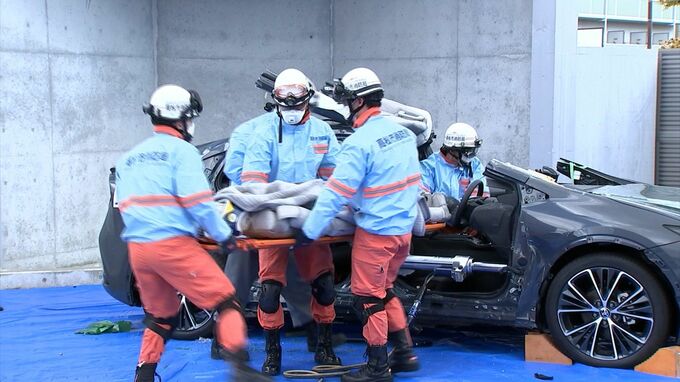 衝突事故を想定したレスキュー訓練が香川県高松市の消防署で行われました。使われるのは、実際の衝突試験で変形した最新のハイブリッド車両です。