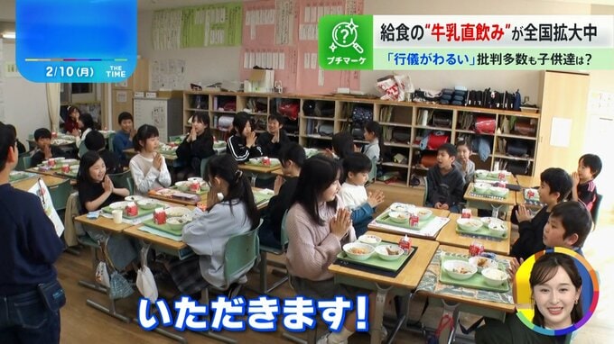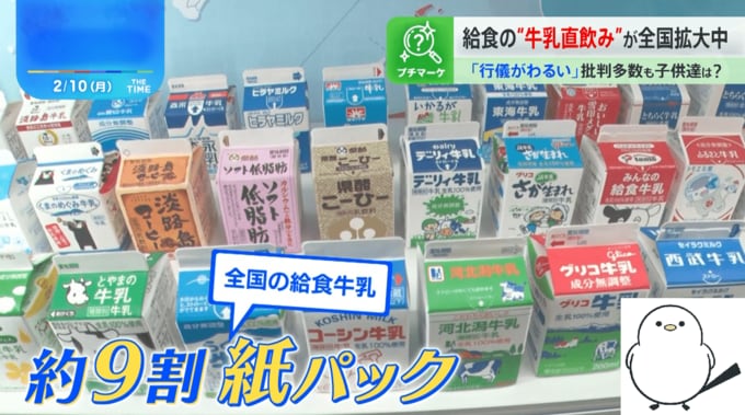 東京の「港区立芝浜小学校」の給食の時間。子どもたちには、家庭で飲む牛乳パックが小さくなったような、四角くて上部が屋根になっている牛乳が配られていますが…