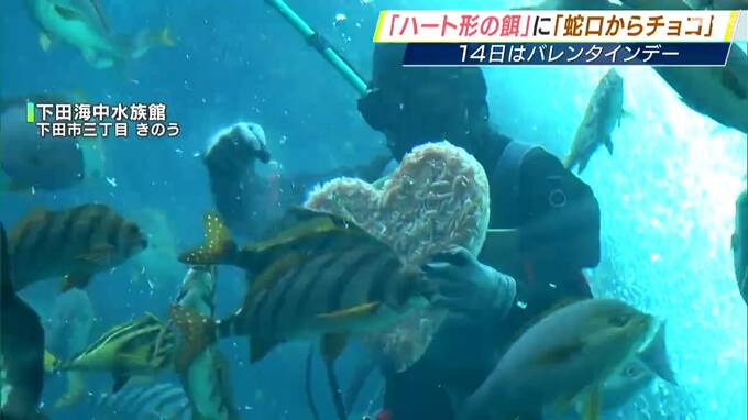 ダイバーが大水槽に持ち込んだのは、ハートの形をした餌。静岡県下田市の「下田海中水族館」では、バレンタインデーにちなんで、今年もハートの形に凍らせたオキアミを魚たちにプレゼントしました。