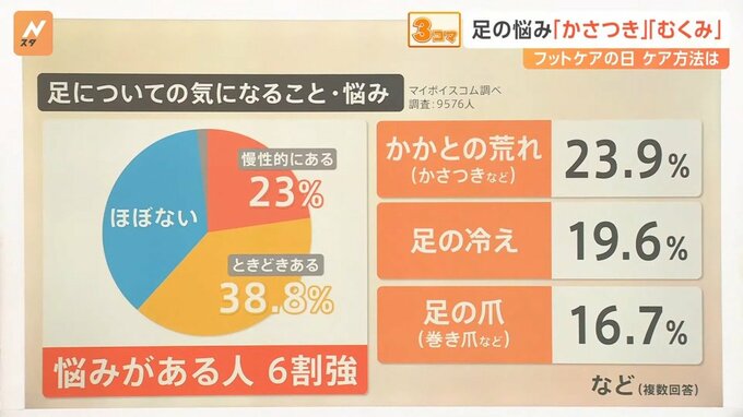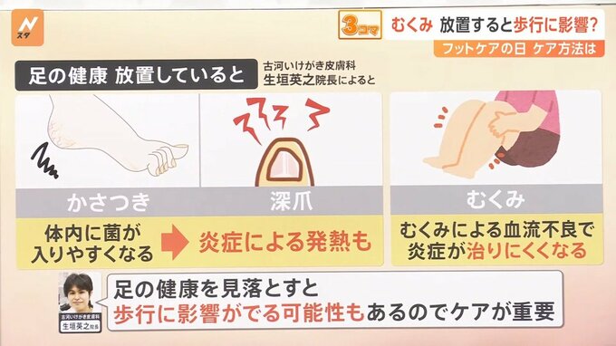 生垣院長は「足の健康を見落とすと、歩行に影響が出る可能性もあるので、ケアが重要」と話しています。