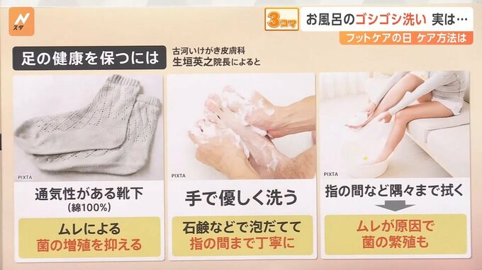 また、洗い方だけではなく「拭き方にも注意」が必要で、足の指の間など隅々まで拭くことが大事です。綺麗に洗っても、ムレが原因でまた菌が繁殖してしまうかもしれないので、しっかり拭きましょうということでした。
