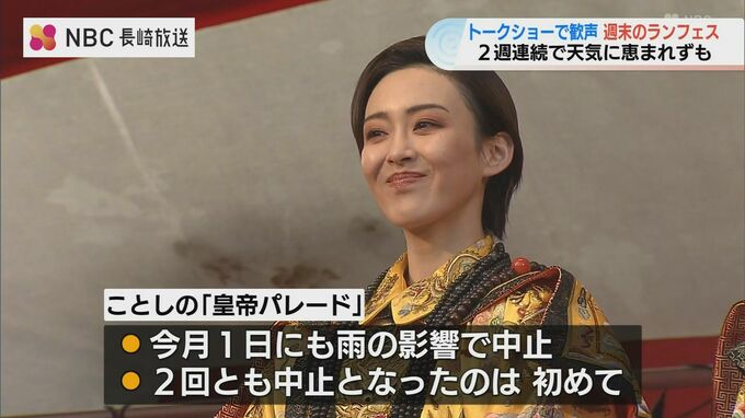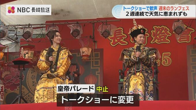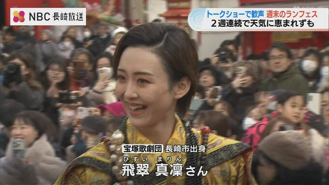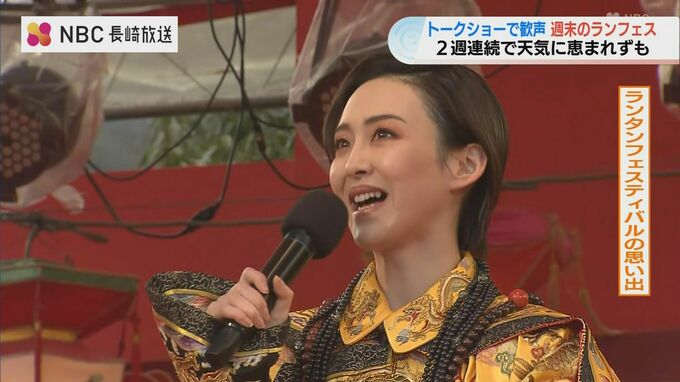 開催中の長崎ランタンフェスティバルは2週連続での中止となりましが、代わりに行われた皇帝・皇后役のトークショーで湊公園は盛り上がりをみせました。登壇したのは長崎出身のタカラジェンヌ・飛翠真凜さんです。