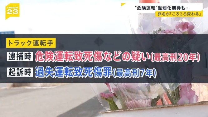 トラック運転手の男は危険運転致死傷(最高刑20年)などの疑いで逮捕されましたが、その後、量刑の軽い「過失運転致死傷罪」(最高刑7年)で起訴されました。