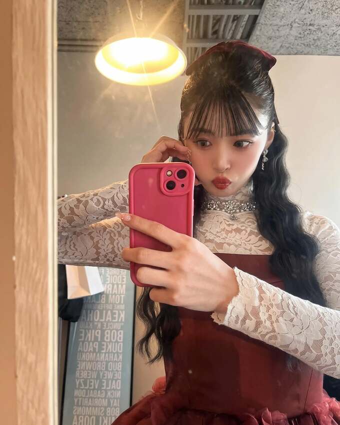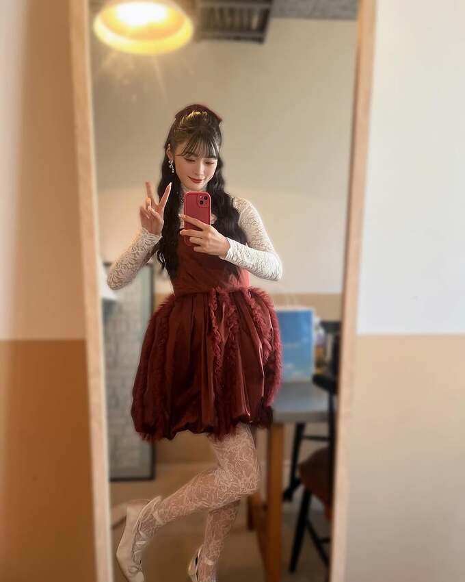 そして「こちらはランチの時のわたし バレンタインに ちなんで赤ドレス♥×リボン」とと綴ると、写真をアップ。