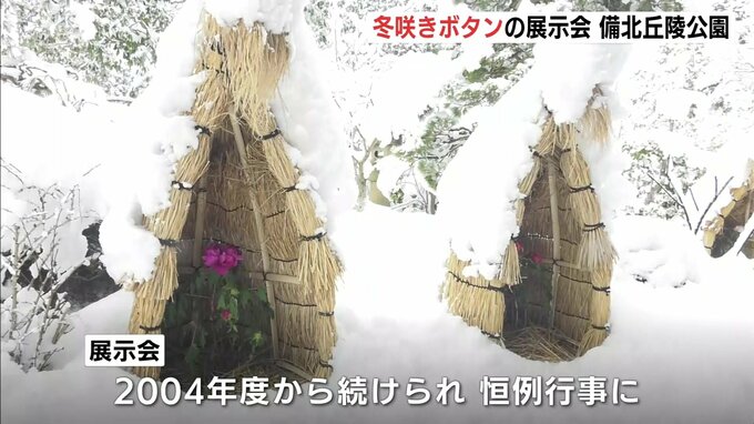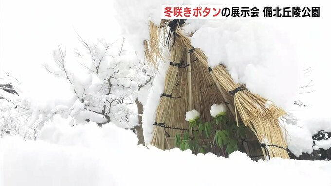 雪の中で咲く「冬咲きボタン」の展示会が、庄原市の備北丘陵公園で開かれています。