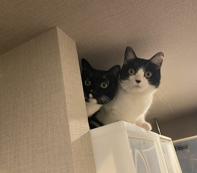 マルとオレオが、高く積まれた衣装ケースと天井の間のすきまで目を丸くして遠くを見つめている写真に、藤さんは「……知らないヒトもう帰りましたか?」とテキスト。マルもオレオも、とても狭い隙間の壁の向こう側から見つめていて、お客さんが来ている間はよほど警戒して隠れていたような様子がうかがえます。