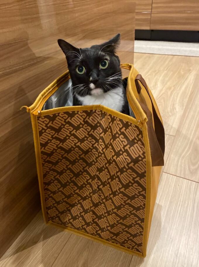 続いては、有名なカレーとケーキのお店の手提げ袋に入り込んだマルが、ちょっと首をかしげた写真を投稿。藤さんは「いつもの紙袋だと思って入ったのが保冷仕様で」「『ん?なんか違うぞ…』が耳に出ちゃってる」と、マルの表情を描写。マルの耳は、真っ直ぐ前に向くでもなく、かといって完全に平らないわゆる ”イカ耳” になるわけでもない、左右揃わない微妙な角度を向いていて、マルの目も片眉だけが上がっているような、いぶかしげな表情をしています。