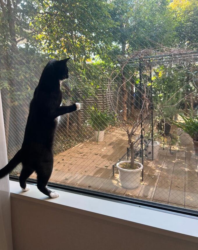 マルが庭を ”監視” する写真に、フォロワーからも各々愛猫が窓から外をキリリとした表情で ”監視” する写真を投げ合い、マル&オレオの行動に似た写真がタイムラインに多くリプライされるなど、共感を集めています。