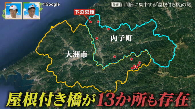 2つの橋はもともと屋根が付いておらず、再建されたタイミングで屋根が付けられたそうですが、その経緯までは集落の人でも知らないようです。このような“屋根付き橋”が、内子町と大洲市にはなんと13か所も存在しているのだとか。