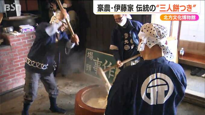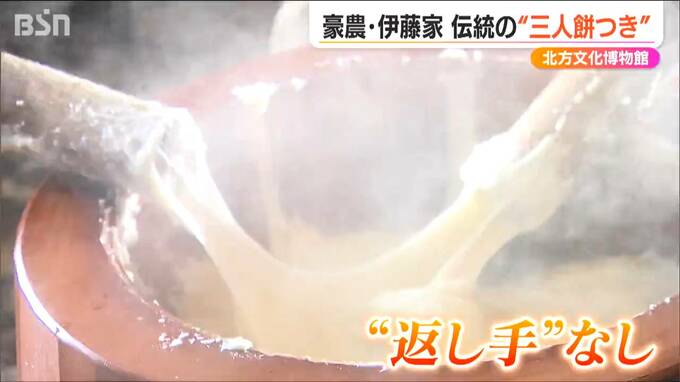 新潟市江南区にある豪農の館『北方文化博物館』で11日、伝統の“餅つき”が行われ、つきたてのお餅が訪れた人たちにも振舞われました。