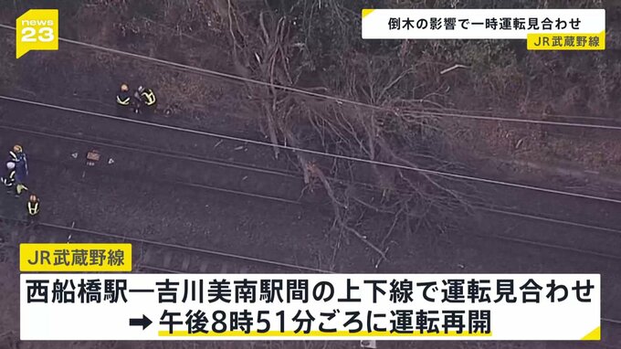 JR東日本によりますと、11日午後3時45分ごろ、千葉県のJR武蔵野線・東松戸駅と新八柱駅の間で、線路沿いの木が倒れているのが見つかりました。この倒木の影響で、西船橋駅と吉川美南駅の間の上下線で運転を見合わ…