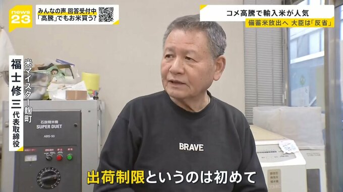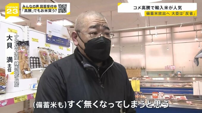 「(備蓄米も)すぐ無くなってしまうと思う。そのとき一瞬、その商品だけは(値段が)下がるかもしれないが、その後が続かないとまだまだコメ不足、値段も上がると思っている」