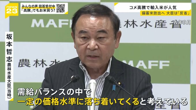 「今後、新米が順次供給をされ、そして円滑なコメの流通が進めば需給バランスの中で、一定の価格水準に落ち着いてくると考えている」
