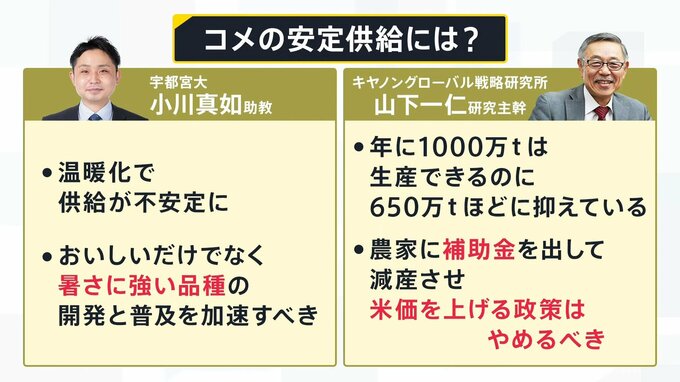 一方、山下研究主幹は「年間に1000万t生産できるのが今の日本だが、650万tほどに抑えられている」と話し、「農家に補助金を出して減産させ、米の価格を上げる政策はやめるべきだ」ということです。米以外のものを作って補助金を出すという政策を一部やっているということなんですよね。