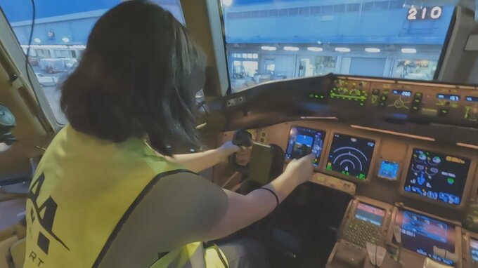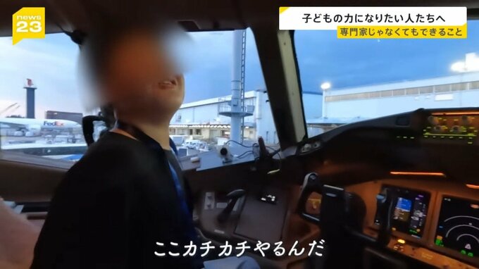 子どもたちは貨物機の操縦席に座った。