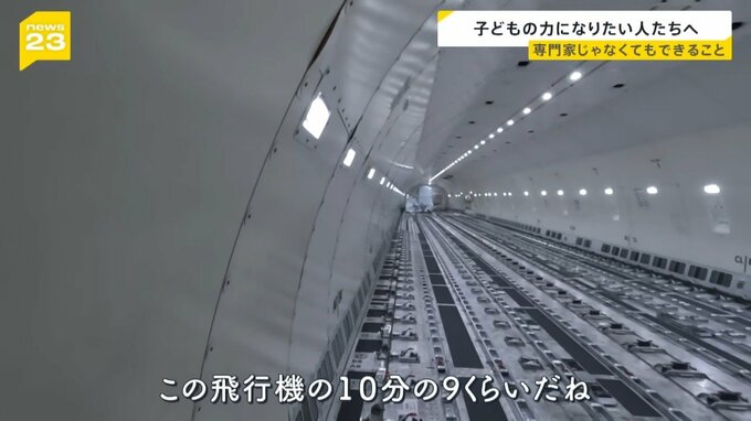 子どもたちは貨物専用機の中に案内された。客席が並ぶスペースにイスはひとつもない。貨物を置くための銀色の空間が広がっていた。