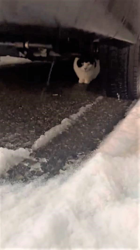 また仲川さんは、降り積もる雪の中、車の下に避難してうずくまる猫の鳴き声を聞いて動画を撮影。「猫、おーい、猫」と呼びかけるも、鳴き続ける猫は警戒しているのか、仲川さんの元には出てきません。