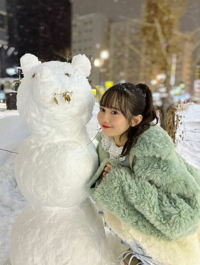 近藤さんは「北海道行ってきます」と一言だけテキストして投稿。その後「雪だるま作った」とテキストして、写真を添えました。その写真には、綺麗な球形に固められた雪を三段積み重ねて、一番上の雪の球体に鼻と耳もつけた、まるでクマのような顔つきの雪だるまと、フリル襟のブラウスと若草色のフリースニットに白のファースカートを合わせた可憐な装いの近藤さんが2ショットで収まっています。