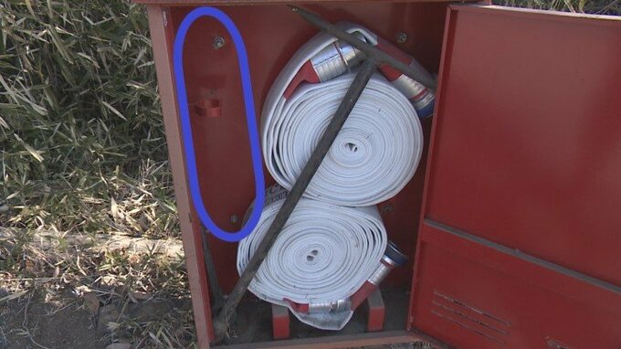 「こちらの格納箱、消火作業のために鍵がかかっておらず誰でも開けられるのですが、中を見てみるとホースの先端部分がありません」
