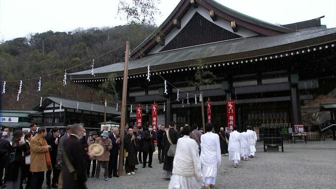 降りしきる雪の中、修行に参加した最上稲荷の稲荷泰秀副山主と共に修行に励んだ中四国の僧侶12人が最上稲荷を訪れました。