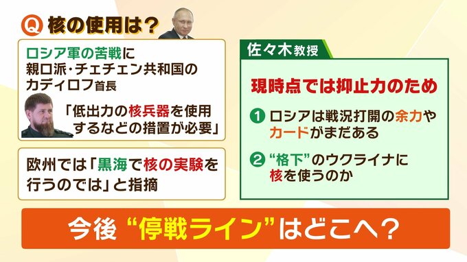 「カディロフ首長の発言は少し解釈が必要だと思います。核兵器の使用について言うのはやはり戦力で、ウクライナの前線で劣勢になっていますので、『核の脅し』をすることによって、ウクライナ軍の進軍を止める、そしてウクライナに支援するアメリカ、ヨーロッパの武器供与を抑える、現実的には抑止力としての発言が高いと思います。しかし、今後ロシア軍が厳しくなってくると(低出力の核使用の)可能性が高まってくる。想像もしたくないんですけども、カディロフ首長の発言というのが今出てきましたのでこれがどんどん核の脅しとしてやっているのか、もしくはその前兆としてやってるかっていう見極めが必要になってくると思います」