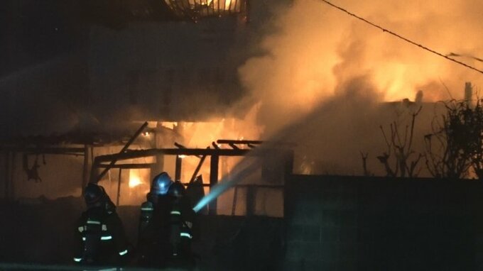 真っ赤な炎が住宅を包み、黒い煙が立ち上ります。