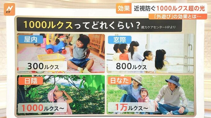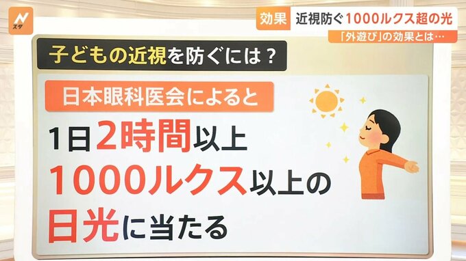 日本眼科医会によりますと、子どもの近視を防ぐには「1日2時間以上 1000ルクス以上の日光に当たる」のが目安だといいます。