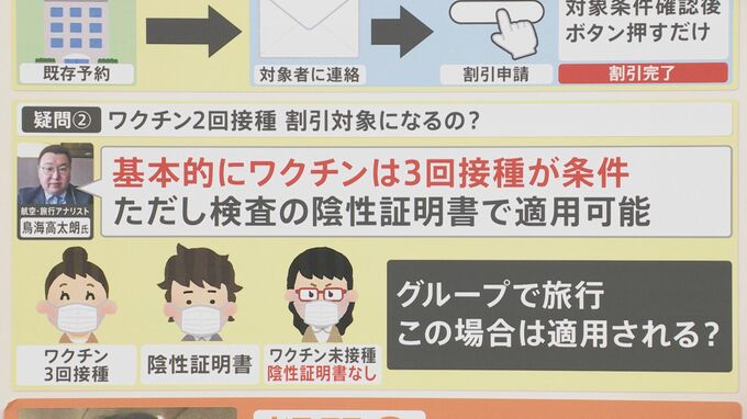 これに関しては県によって対応が異なりまして、ある県では1人でもワクチンを打っていないとグループの全員が割引を受けられないというケースと、ワクチンを打っていない、もしくは陰性証明書がなければその人だけが割引が適用できないというケースの二つ生じることになります。