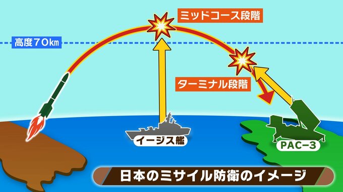 ーーミサイルは放物線を描いた軌道で飛行します。そして一番軌道の高い部分、頂上から落下を始める、この辺りをミッドコース段階というそうです。高度70kmを超えているとき海上のイージス艦で迎撃をするということになっています。さらにそこから高度が落ちて、目標地点に向けて落ちていくあたりをターミナル段階というそうで、高度70kmより低かった場合、地上の『PAC3』で迎撃します。どこに位置するかによって、イージス艦がPAC3かで対応する。ひとまず日本のミサイル防衛はイージス艦とPAC3でカバーされているということでいいですか?