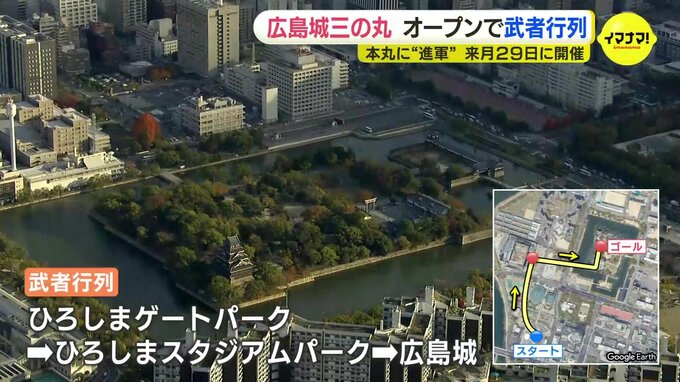 オープンに合わせて行われる武者行列は、「ひろしまゲートパーク」をスタートします。「ひろしまスタジアムパーク」を経て、広島城本丸まで進軍するコースで、およそ40人の甲冑姿の武者たちが2キロを練り歩きます。