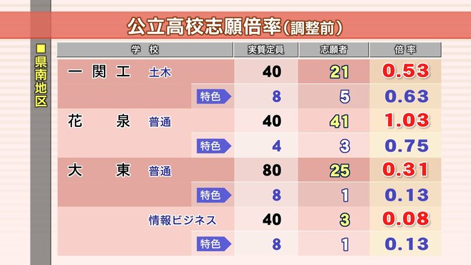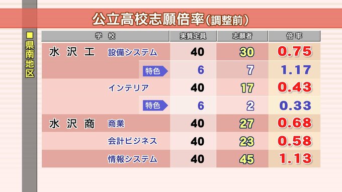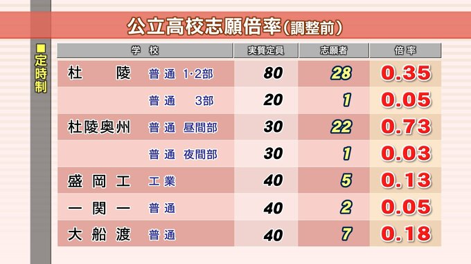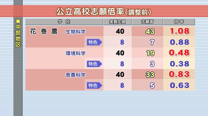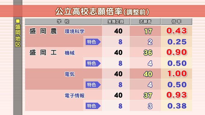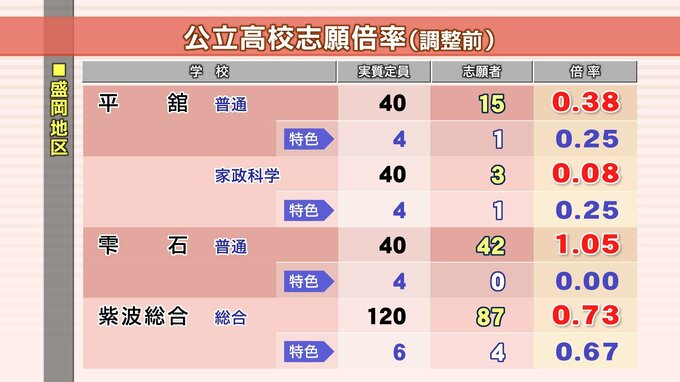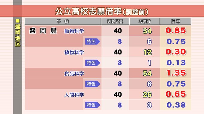 最も倍率が高かったのは盛岡農業食品科学科の1.35倍で、次に盛岡四高普通科の1.29倍、盛岡一高普通・理数科の1.26倍と続きました。