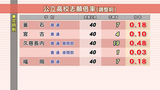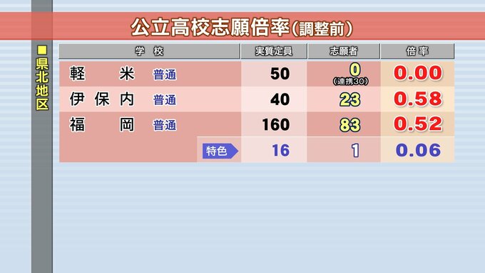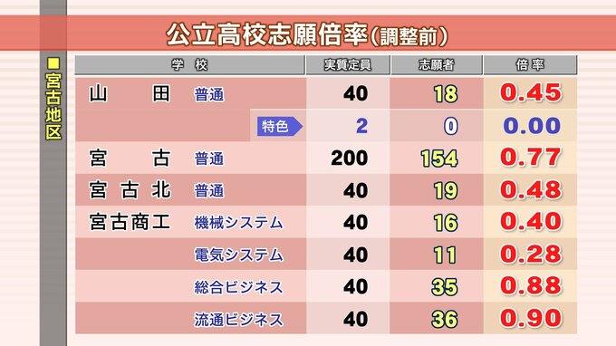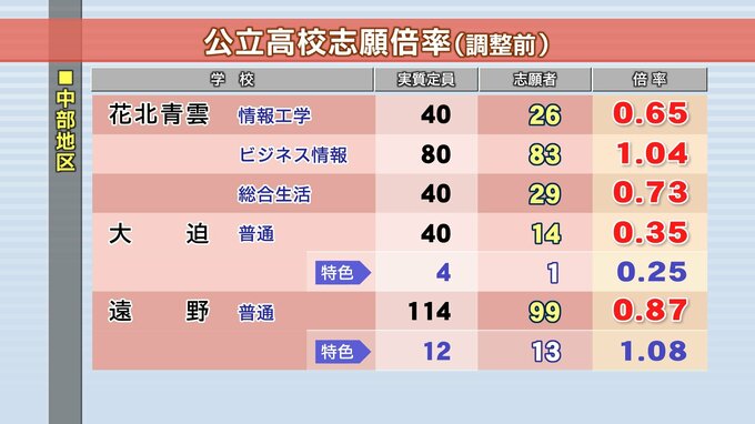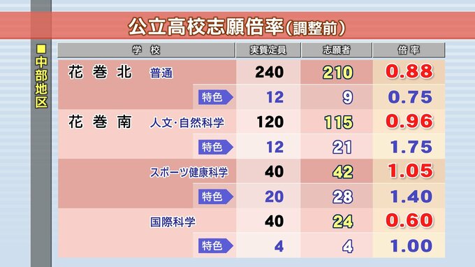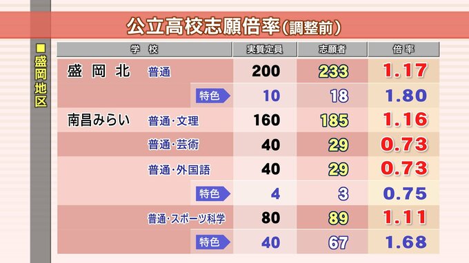 また13日は盛岡市立高校の志願倍率も発表され、普通科の特別進学コースが1.24倍。普通科普通コースと商業科が1.23倍となりました。