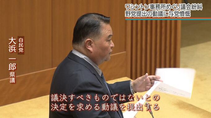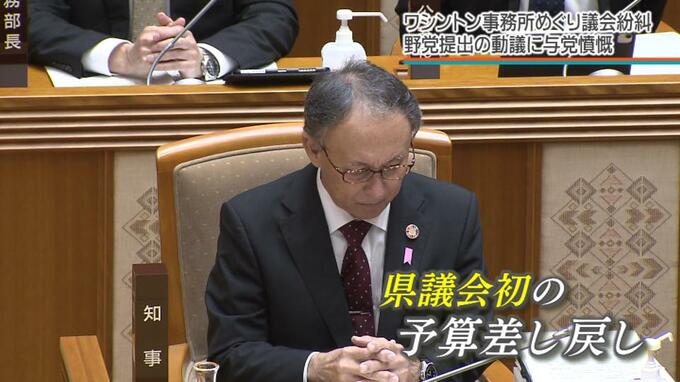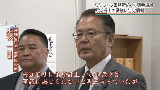 会派=沖縄自民党・無所属の会は、ワシントン事務所問題について調査や検討が続く中での予算計上は「議会を軽視している」などと指摘。