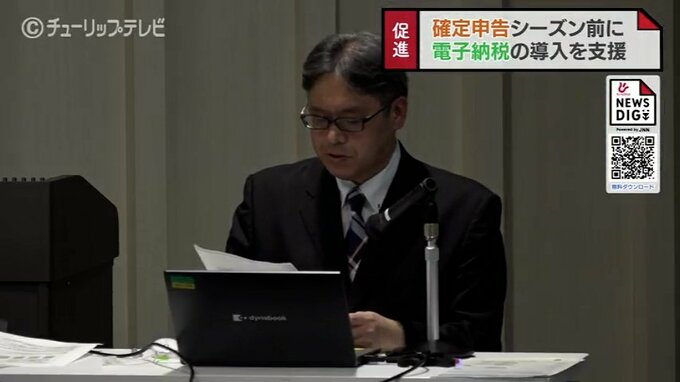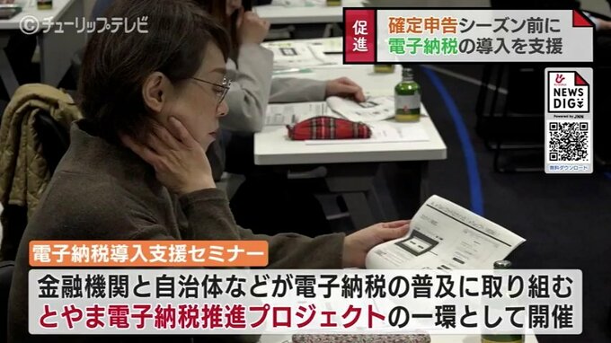 富山県高岡市の富山銀行本店では確定申告のシーズンを前にe-Taxなど電子納税の普及と利用促進を目的としたセミナーが開かれました。