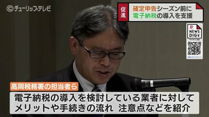 13日は高岡税務署の担当者らが電子納税の導入を検討している事業者に対してキャッシュレス納付のメリットや具体的な手続きの流れ、注意点などを紹介しました。