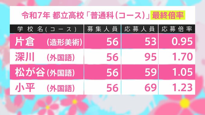 東京都立高校入試2025 全日制普通科 最終志願倍率は日比谷2.00倍、西1.62倍、国立1.53倍に【令和7年度高校受験】 TBSテレビ 2025年2月13日(木) 18:50 国内 普通科(コース制)一覧 深川(外国語)1.70倍、小平(外国語)1.23倍