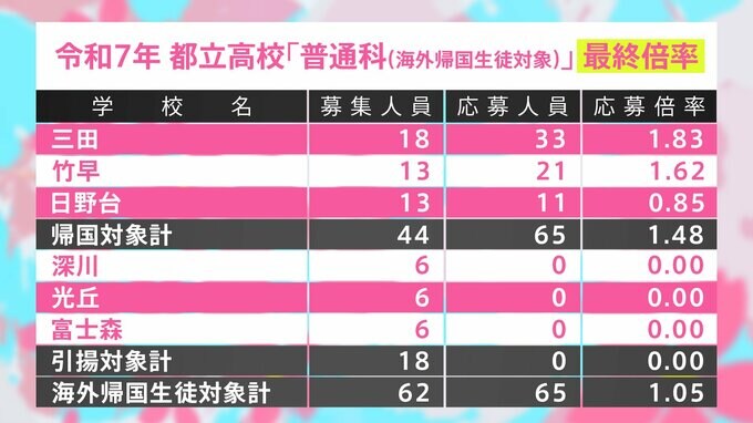 東京都立高校入試2025 全日制普通科 最終志願倍率は日比谷2.00倍、西1.62倍、国立1.53倍に【令和7年度高校受験】 TBSテレビ 2025年2月13日(木) 18:50 国内 普通科(海外帰国生徒対象)一覧 三田1.83倍、竹早1.62倍