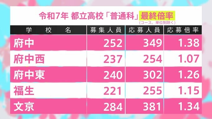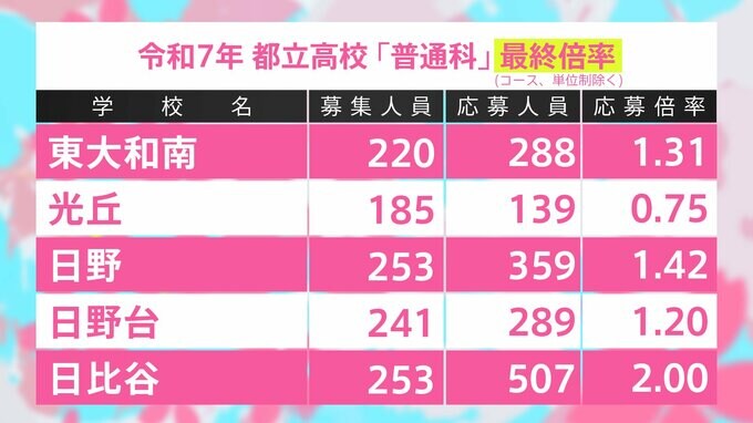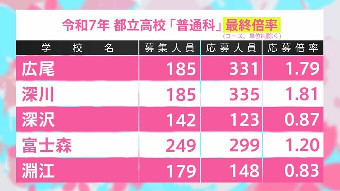 東京都立高校入試2025 全日制普通科 最終志願倍率は日比谷2.00倍、西1.62倍、国立1.53倍に【令和7年度高校受験】 TBSテレビ 2025年2月13日(木) 18:50 国内 学校別の一覧 日比谷2.00倍、深川1.81倍