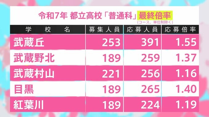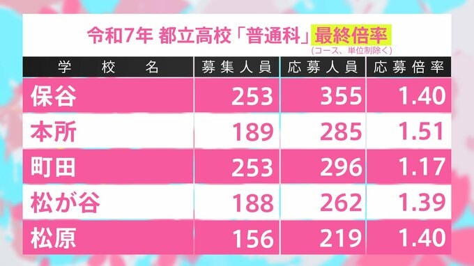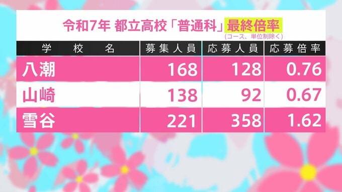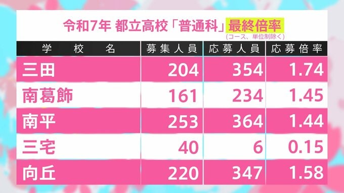 東京都立高校入試2025 全日制普通科 最終志願倍率は日比谷2.00倍、西1.62倍、国立1.53倍に【令和7年度高校受験】 TBSテレビ 2025年2月13日(木) 18:50 国内 学校別の一覧 三田1.74倍、雪谷1.62倍