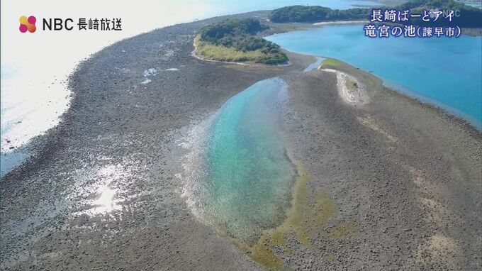 ふるさと再発見「長崎ばーどアイ」。干潮の時だけ姿を現す幻の湖、橘湾にある「竜宮の池」です。干潮の時にだけ現れる“海の湖”竜宮の池(諫早市)飯盛町後田の沖合、普段は灯標以外が沈んでいる瀬。潮が引くと湖…