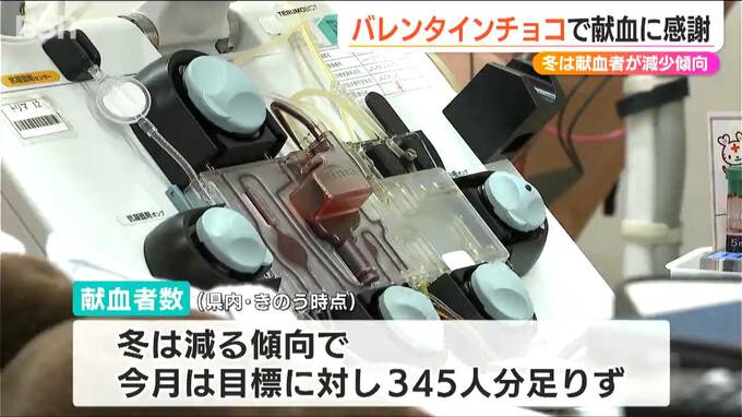 また、天気が悪く体調も崩しやすい冬の時期には献血者数が減る傾向にあり、今年の2月は、目標に対して345人分足りないということです。