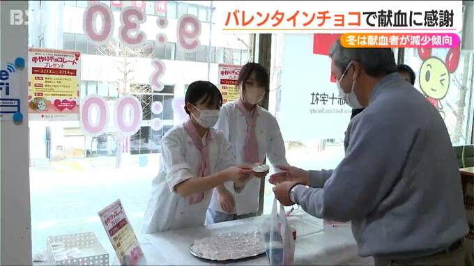 バレンタインを前にした13日、専門学校生が“献血ルーム”で手作りのチョコレートを配り、献血の協力を呼びかけました。