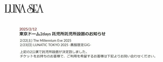 続けて「2/22(土) The Millennium Eve 2025」「2/23(日) LUNATIC TOKYO 2025 -黒服限定GIG-」「上記の2公演で託児所設置が決定致しました。」と、記しました。